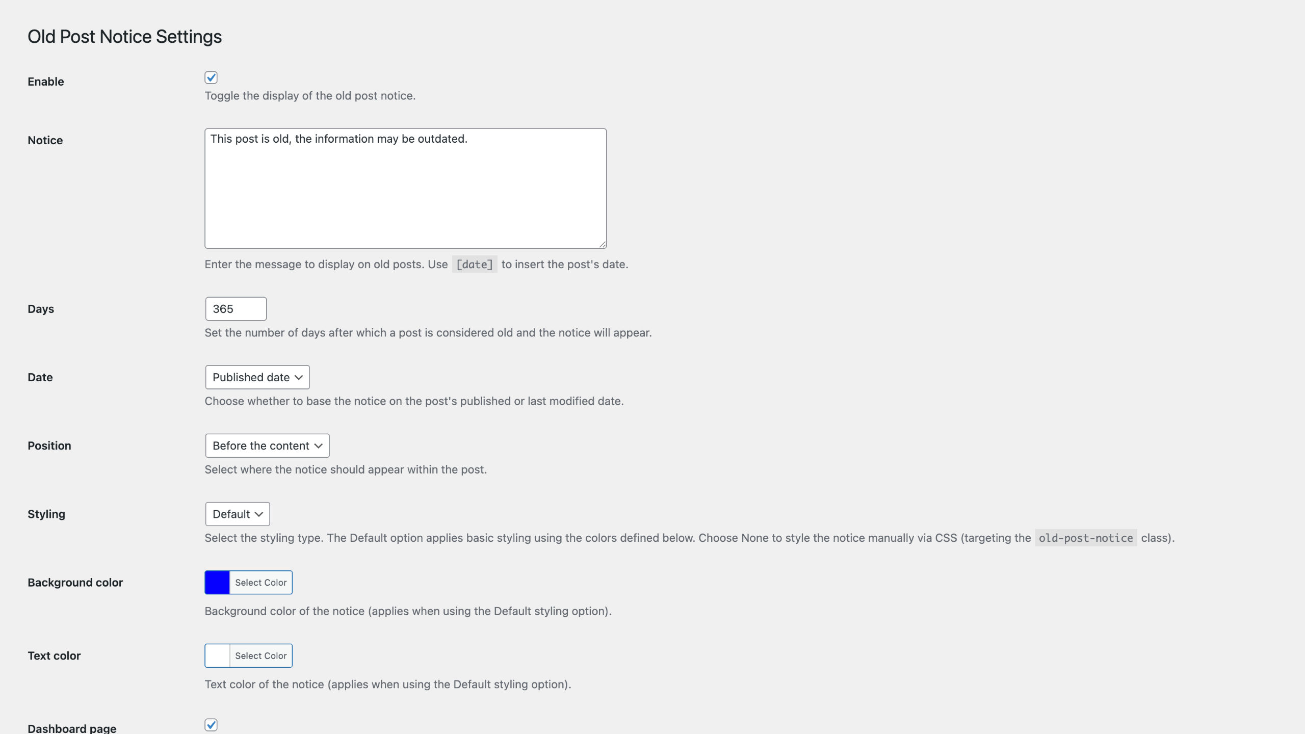- Add: Dashboard page under the posts menu that displays all posts that are displaying the old post notice, disabled by default