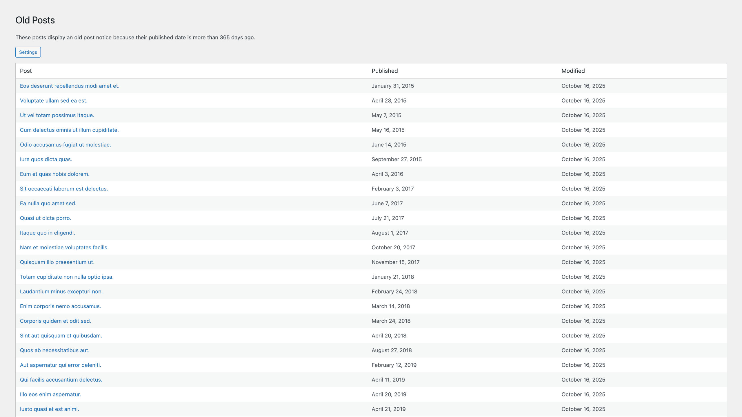 Access a comprehensive dashboard page that lists all posts displaying the old post notice, giving you complete visibility and control over your archive content management. -